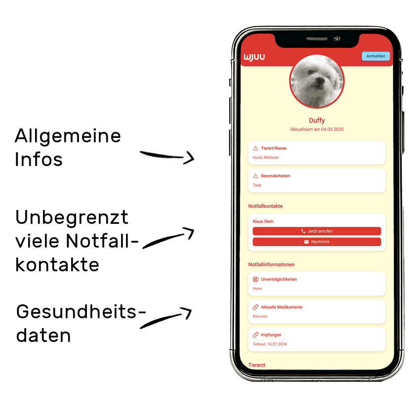 Im Notfall zählt jede Sekunde. Durch Scannen des integrierten QR-Codes erhalten Ersthelfer oder informierte Personen sofort Zugriff auf ein detailliertes Notfallprofil Ihres Haustieres. Dieses Profil beinhaltet alle relevanten Informationen, die im Ernstfall entscheidend sein können: Kontaktdaten Ihres Notfallansprechpartners, wichtige medizinische Details wie Vorerkrankungen, Medikamentengabe oder Allergien sowie besondere Verhaltensweisen oder Bedürfnisse Ihres Tieres.