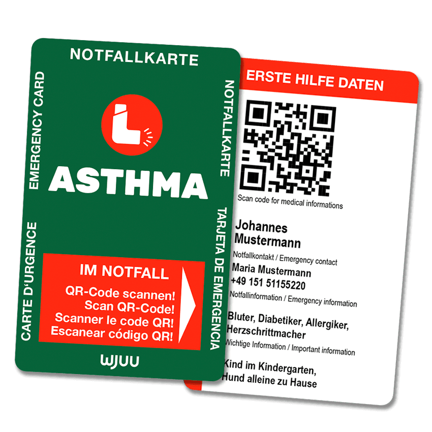 Die speziell für Menschen mit Asthma entwickelte Karte unterstützt eine schnelle und gezielte Versorgung bei Atemnot oder allergischen Reaktionen. Im handlichen Kreditkartenformat passt sie bequem in jedes Portemonnaie und ist somit jederzeit griffbereit. Über den integrierten QR-Code gelangen Helfer direkt zu Ihrem persönlichen Notfallprofil, in dem alle relevanten Daten übersichtlich hinterlegt sind.