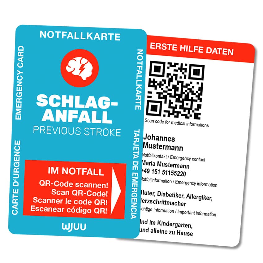 Ob zu Hause, in der Schule, am Arbeitsplatz oder auf Reisen, die Schlaganfall Notfallkarte bietet Sicherheit für Sie und Ihre Angehörigen. Im Notfall stehen alle relevanten Informationen innerhalb von Sekunden bereit, um eine schnelle und effektive medizinische Versorgung zu gewährleisten.